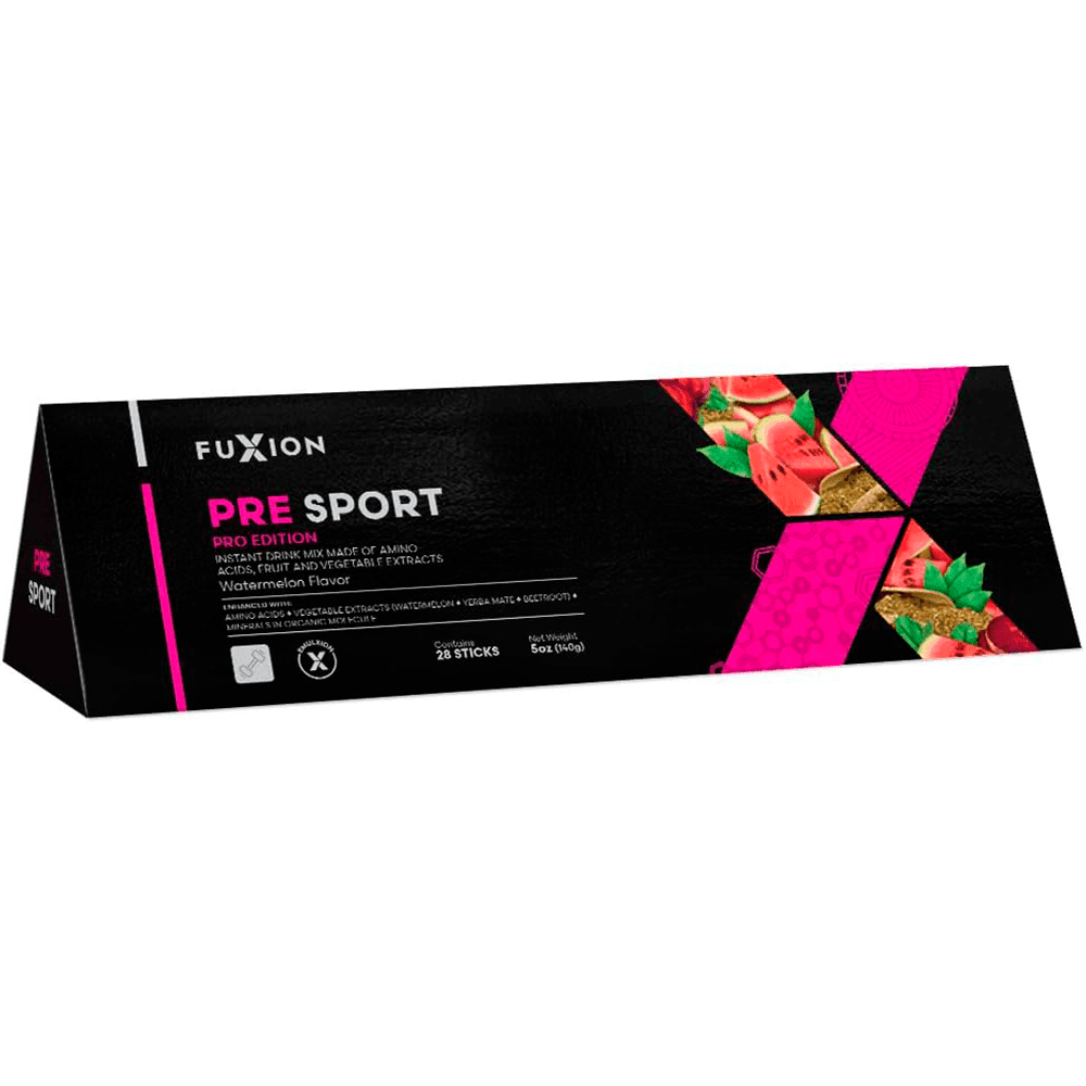 PRE-SPORT FUXION ESPAÑA es una bebida isotónica, re-hidratante y energizante natural que prepara el cuerpo para la actividad deportiva intensa y mejora tu rendimiento durante el ejercicio. Es una deliciosa bebida natural en polvo que viene en sobres individuales, con sabor sandía, endulzada con estevia, que aporta vitaminas y nutrientes para el bienestar físico antes de entrenar.